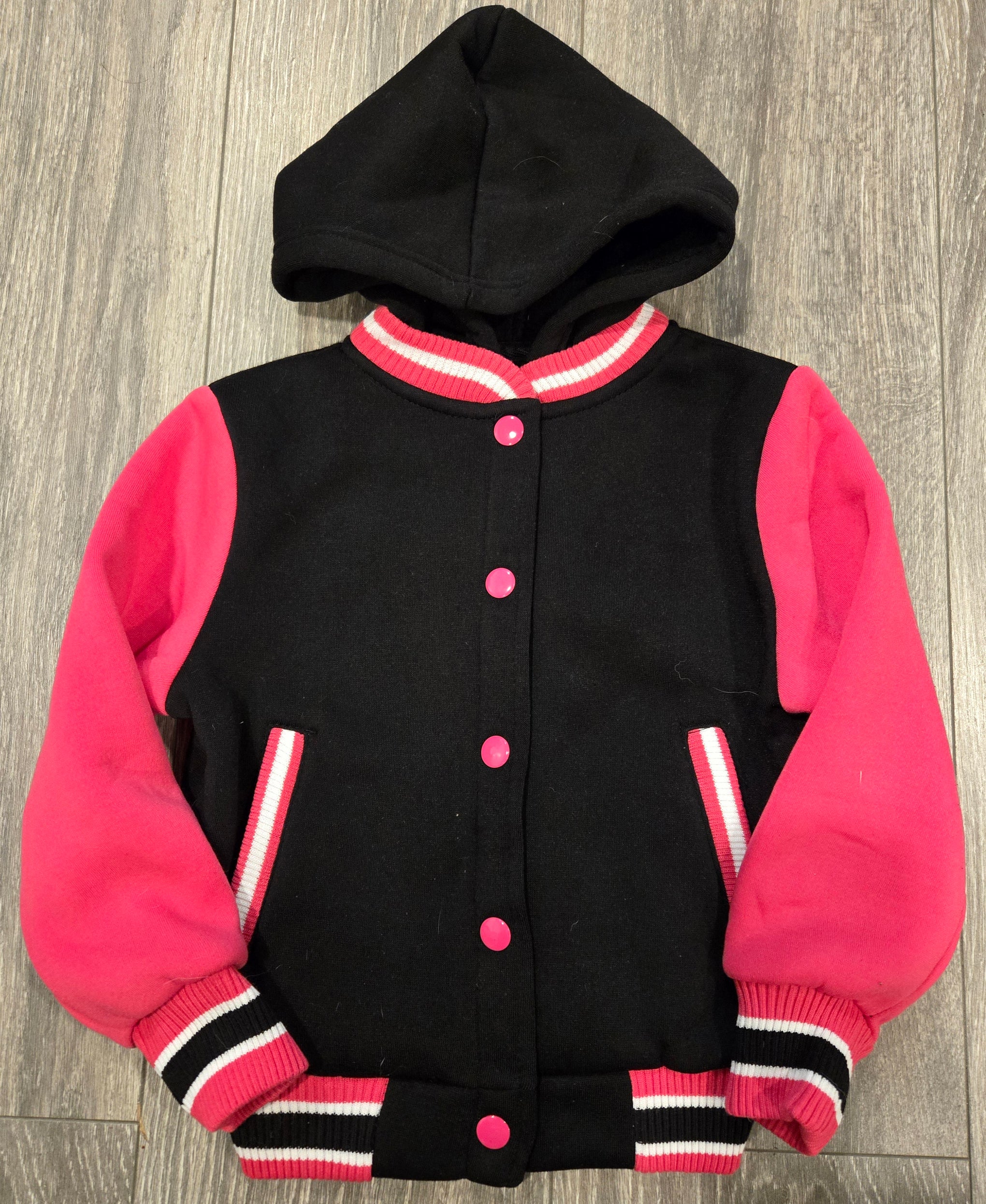 This Kids Girls Pink Letterman Jacket brings fun and comfort together with its vibrant color and cozy hood. Made from lightweight 100% polyester, it’s easy to snap on and perfect for active days. Its soft material keeps her warm without the bulk, making it a playful addition to any outfit.