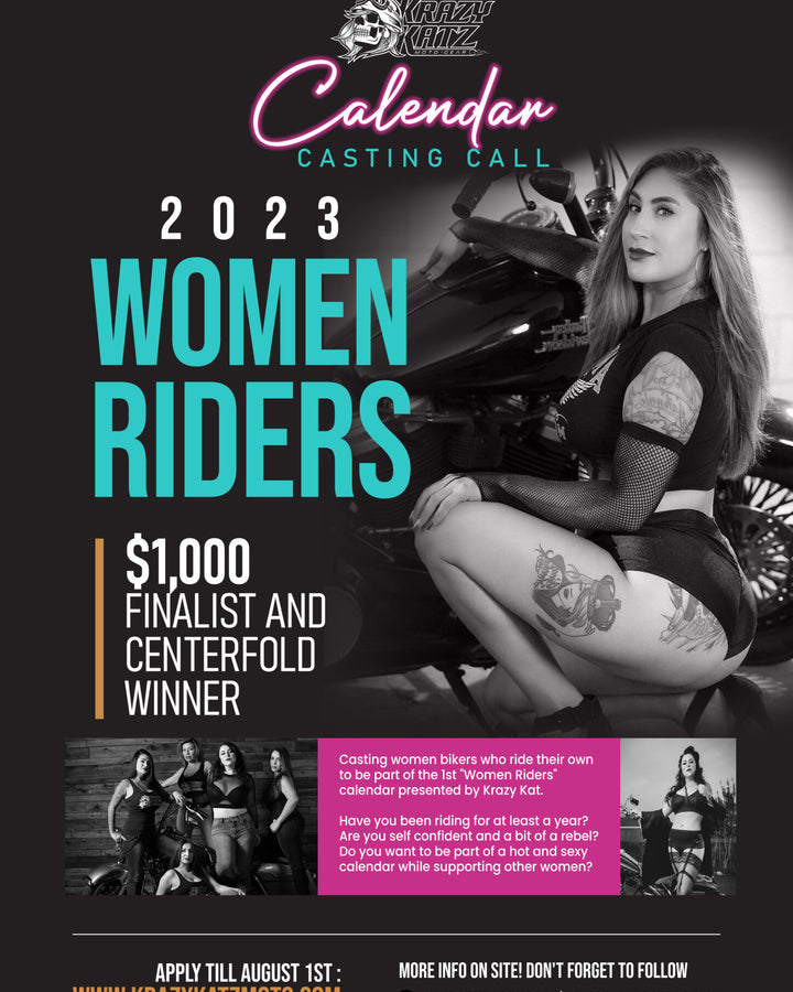 Hey Ladies! Krazy Kat is announcing her 1st calendar model search featuring women who ride. Do you own a motorcycle? Have you been riding for more than a year? Are you wanting to inspire other women by showing that you could be sexy, confident and ride your own? Do you want to be in the hottest and sexiest calendar for 2023? Then, you are just what we are looking for!Not only is this about bringing out your inner seductive side but it’s also about meeting other women who ride and building a positive bond in the riding community. Krazy Kat is all about motivating, supporting, and encouraging women to ride. She tries to present her humor, quirkiness, and crazy side to show that we are all beautiful in our own ways.So who’s ready to be part of 2023’s Calendar “Women Riders” experience that you will never forget or regret?!